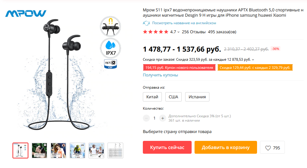Модель называется Mpow H7 Plus. И заметьте, что у этого производителя есть еще модель Mpow H7, которая точно такая же, только без поддержки aptX (если вам смотреть кино или слушать радиопередачи - и без aptX вполне можно обойтись), при этом стоит и вовсе 1600 рублей (и бывает четырех различных цветов).