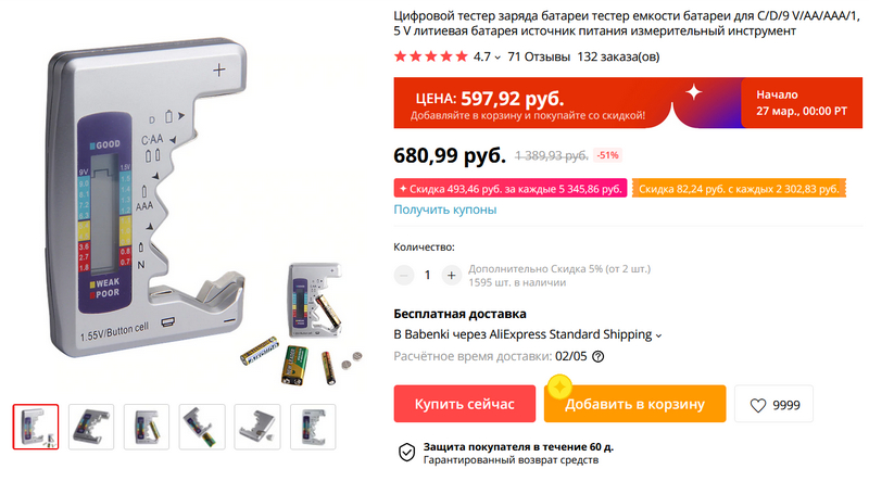 Универсальный батарейный тестер - крайне полезная штука для проверки уровня заряда различных батареек. Постоянно пользуюсь, много раз меня выручал.
