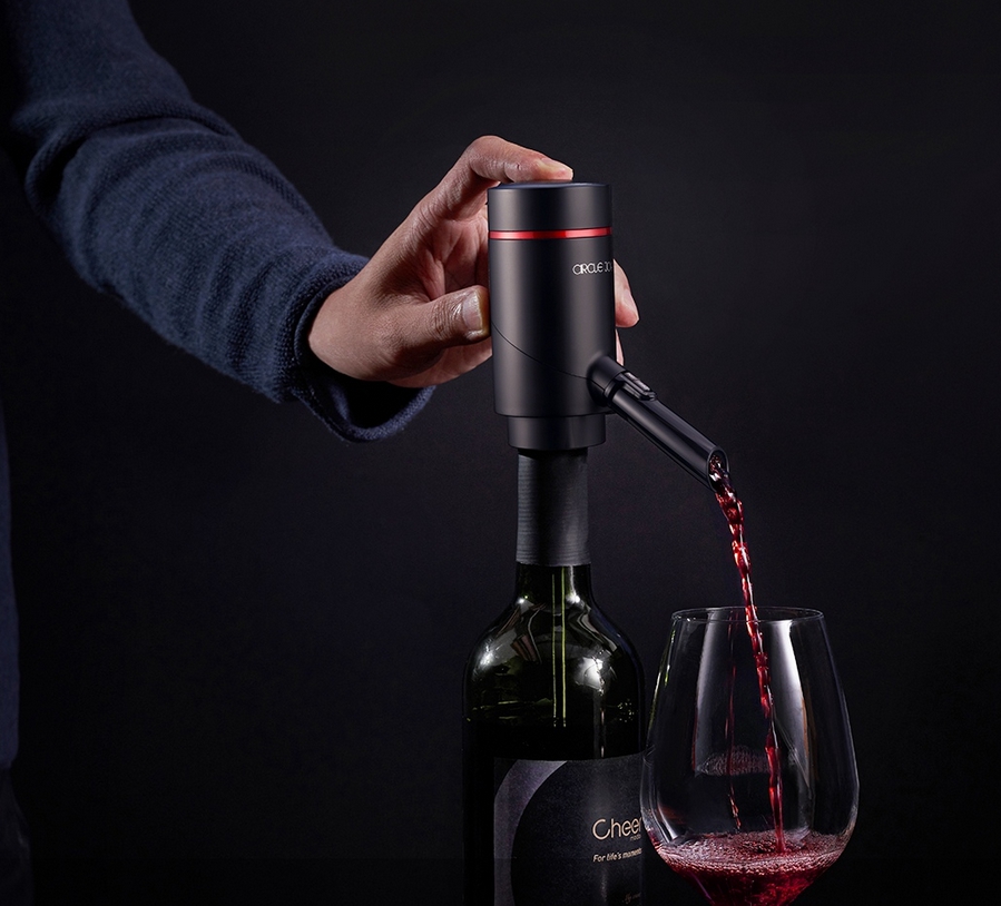 Надевается на горлышко бутылки, затем нажимаете кнопку и вино наливается само. Во время работы не издает громких звуков. Разъем USB находится на задней части дозатора.
