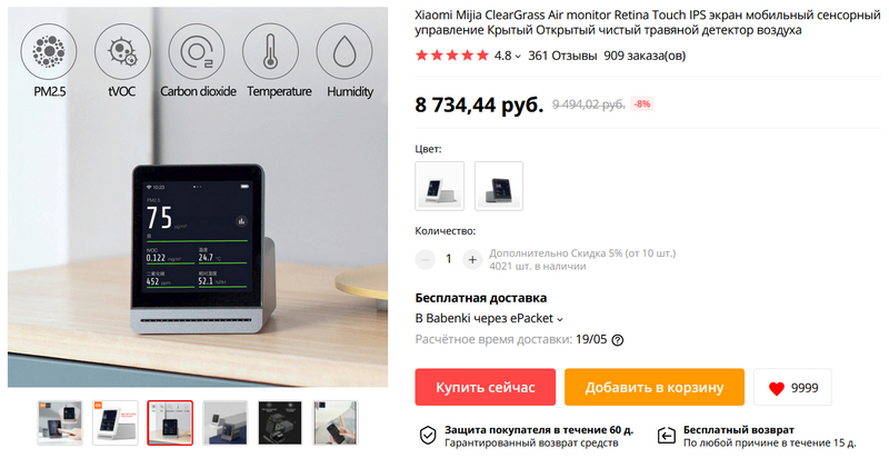 Многофункциональное устройство Xiaomi Mijia ClearGrass Air monitor. Сенсорный экран, подключается к сети Wi-Fi, имеет самые разнообразные виджеты, которые можно переключать. Показывает время, прогноз погоды и влажность в помещении, но самое главное - измеряет и показывает уровень частиц PM 2.5 (смог, дым, мелкодисперсная пыль), уровень углекислого газа (это очень важно измерять) и уровень tVOC (это летучие органические вещества). Также выводит температуру на улице и индекс уровня загрязненности в регионе AQI. Синхронизируется со смартфоном через собственное приложение или Mi Home, выдает данные на смартфон. Нашел подробный обзор этого анализатора, автор которого тестировал работу датчиков загрязнения.