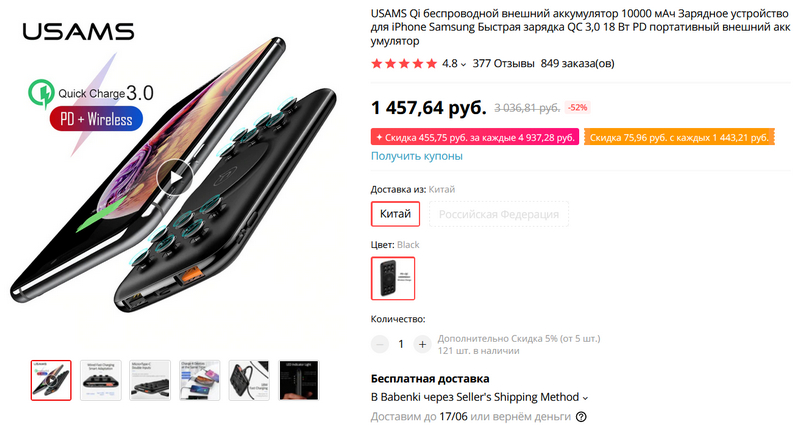 Любопытный внешний аккумулятор на 10000 мАч. Поддержка QC 3.0 и Power Delivery, присоски, чтобы сцеплять аккумулятор со смартфоном.