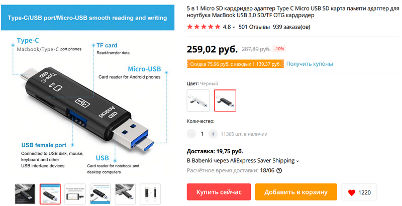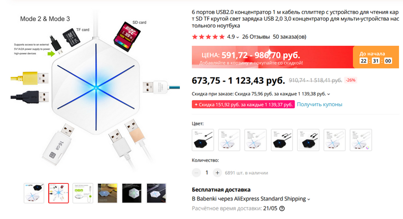 Шестипортовый USB-хаб с метровым проводом, он же - кардридер под microSD и SD. Удобная штука, заказал себе.