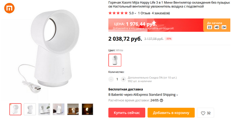 Как раз к лету - вентилятор-увлажнитель с подсветкой от Xiaomi. Три в одном. С регулировкой силы обдува.
