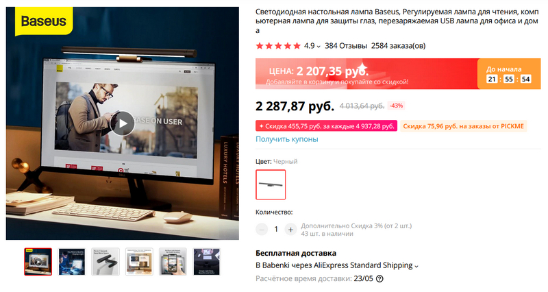 Светодиодная настольная лампа от Baseus на монитор - для неяркого освещения рабочего места. Заказал себе: я очень не люблю верхний яркий свет в кабинете, с такой лампой, я думаю, будет именно то, что нужно.