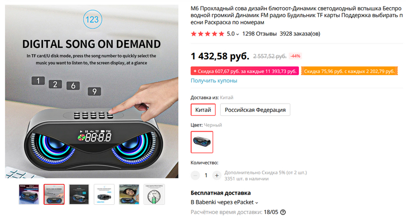 Симпатичная Bluetooth-колонка с будильником и подсветкой. На Ali ее обозвали "прохладный сова дизайн" - а и правда чем-то сову напоминает, но прохладой, врать не буду, не веет. Умеет воспроизводить музыку как по BT, так и с карт microSD или подключенных по USB накопителей. Есть FM-радио. Есть доставка с российского склада.