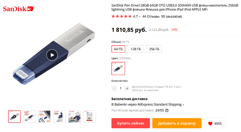 А это для айфонов/айпэдов - адаптер-накопитель на 64, 128 или 256 ГБ.