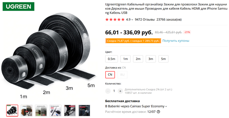 Качественная лента-липучка UGREEN для организации и крепления кабелей. Мне с какими-то их аккумуляторами пару раз приезжала такая лента, но в виде небольшого отрезка. Качество - просто отличное, я давно использую. А тут ее, оказывается, можно купить и полметра, и метр, да хоть пять метров - и нарезай потом под свои надобности! Это удобнее, чем пластиковые хомутики, как мне кажется.