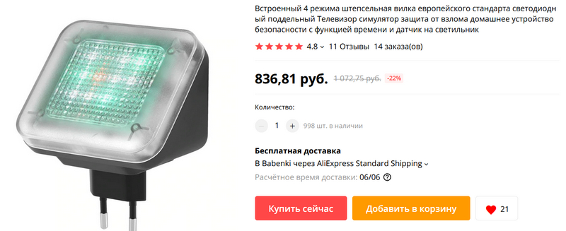 Любопытная и полезная штука - имитатор работы телевизора. Включается в розетку, имеет датчик освещенности. В сумерках включается и начинает работать, отбрасывая на стены меняющиеся отблески, похожие на отблески работающего телевизора. Есть несколько режимов работы по таймеру. Уезжаете из квартиры/дома, хотите создать имитацию своего присутствия - данная штука и поможет это сделать.