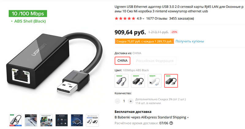 Очень полезный переходник для современных ноутбуков/ультрабуков, где, как правило, уже не устанавливают порт RJ-45 для проводного Интернета. И здесь есть два варианта: переходник под USB 2.0 со скоростью до 100 мегабит, и переходник под USB 3.0 со скоростью до гигабита. Я себе гигабитный и взял, у меня есть только 100-мегабитный.