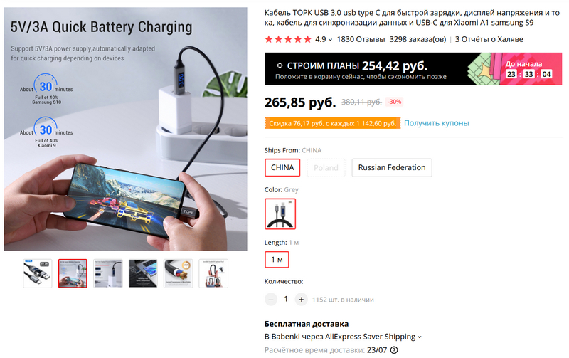 Люблю такие штуки - кабель, который показывает параметры зарядки (вольты и амперы). Метровый, Type-C, поддерживает до 5V/3A. Есть доставка из РФ, но там цена доставки - больше, чем стоимость кабеля. А из Китая доставка бесплатная.