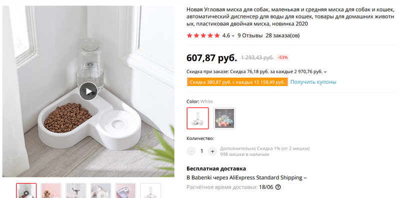 Угловая кормушка для домашних любимцев с автоматической подачей воды из диспенсера.