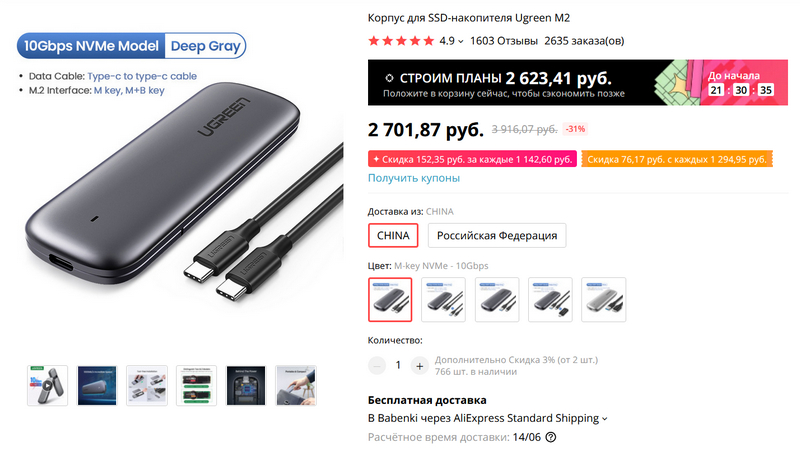 Корпус для накопителя SSD формата M.2 - от Ugreen. Покупаете SSD M.2 нужного производителя и нужной емкости, вставляете в этот корпус - получаете сверхбыстрый внешний диск.
