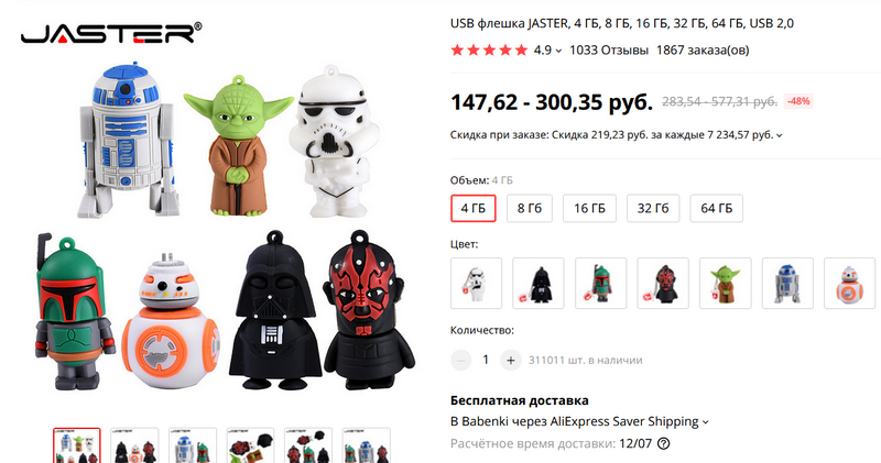 Флешка для ребенка в виде персонажа из любимых фильмов. Это у меня Юный Каталан углядел, он фанат "Звездных войн".