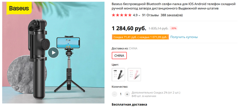 Удобный телескопический монопод-селфипалка от Baseus. Может управляться дистанционно по Bluetooth, есть пульт. Выглядит достойно, я похожий использую - очень доволен.