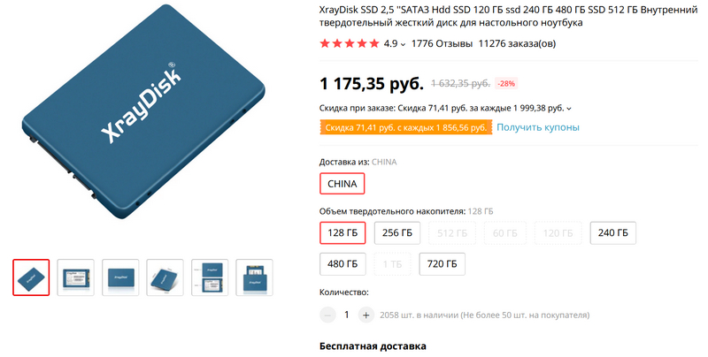Дешевый SSD от XrayDisk различных размеров. Отзывы хорошие, 11 тысяч заказов. Я себе полгода назад заказал вот такой терабайтный SSD KingDian (там есть и другие размеры), народ при этом высказывал опасения в том, что он, цитирую, "сдохнет через неделю". Так вот, полгода пашет в режиме 24х7, проблем никаких нет, скорости хорошие, я очень доволен.
