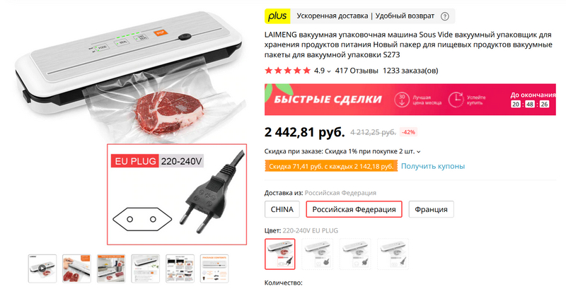 Есть доставка с российского склада. Также для него сразу имеет смысл прикупить пакеты - вот наборы этого производителя, и тоже есть доставка с российского склада, но там только два вида размеров. Из Китая - аж девять видов.