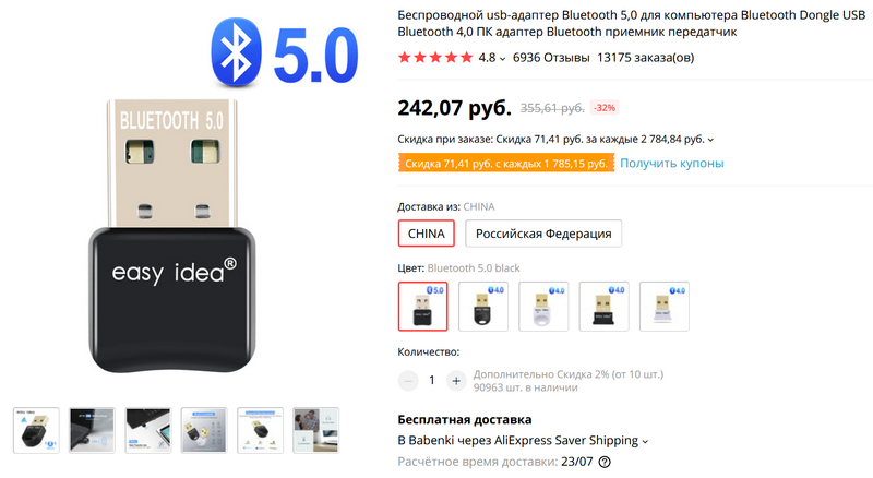 Беспроводной адаптер с поддержкой Bluetooth 5.0. Может служить для различных целей. Обычно такой адаптер используют с ПК для подключения беспроводной мыши, беспроводной клавиатуры и так далее. Чем более современный протокол, тем больше дальность и меньше проблем с коннектом. Есть быстрая поставка из РФ, но дороже.