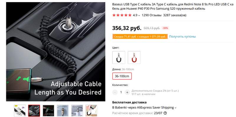 Витой пружинный кабель Type-C от Baseus. Предназначен прежде всего для использования в автомобиле, но может пригодиться и в других случаях, когда нужен не занимающий места кабель, способный растянуться до метра. Имеет световой индикатор процесса зарядки.