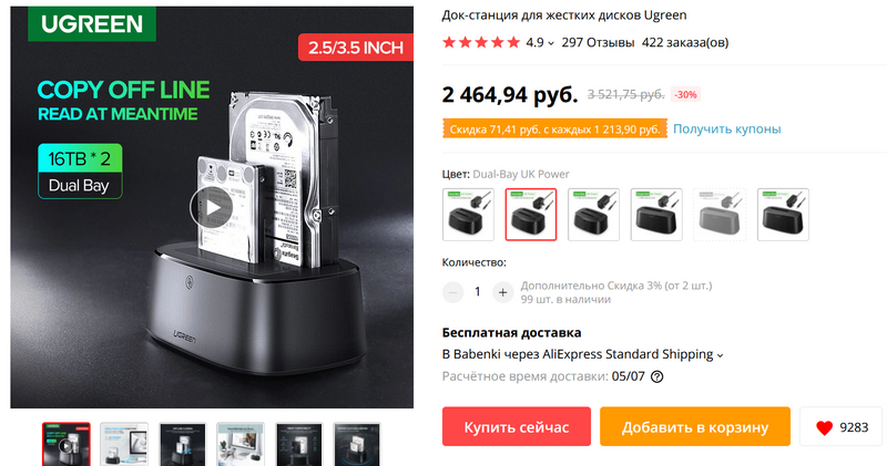 Докстанция на два диска 2,5-3,5" от Ugreen. Емкость каждого диска - до 16 ТБ. Есть кнопка для офлайнового копирования, то есть можно сдублировать весь диск без подключения к компьютеру. Очень удобная штука, у меня дома сразу три таких докстанции используются: две по два диска подключены к NAS и на них хранятся всякие крупные медиаданные, к которым не нужен постоянный доступ (такая докстанция умеет переводить диски в спящий режим), еще одна - к рабочему компьютеру и на нее делаются всякие бекапы. Там же по ссылке есть однодисковая версия, она дешевле на 700 рублей.