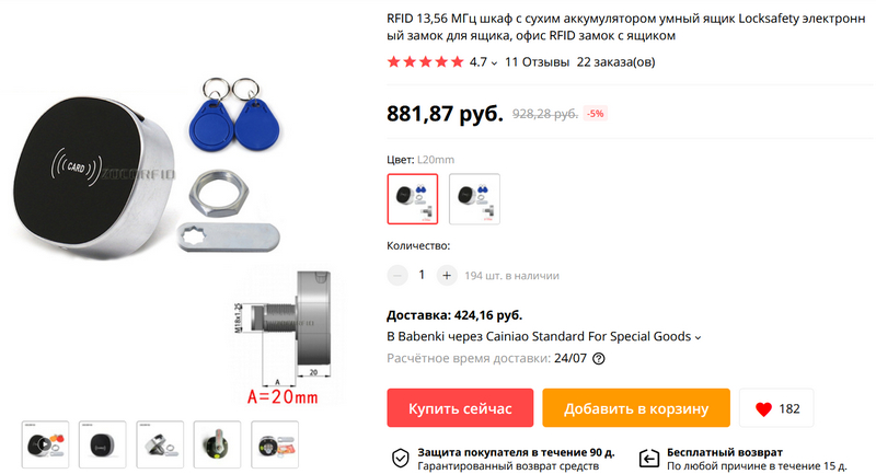 Любопытная штука - замок для почтового ящика с RFID (есть двух разных диаметров резьбы). Ставите этот замок, вешаете на связку ключей маленький легкий брелок, открываете почтовый ящик прикладыванием брелока. В комплекте два брелка. Доставка обойдется в 424 рубля, однако вариант с бесплатной доставкой стоит 1436 рублей, так что этот - дешевле.
