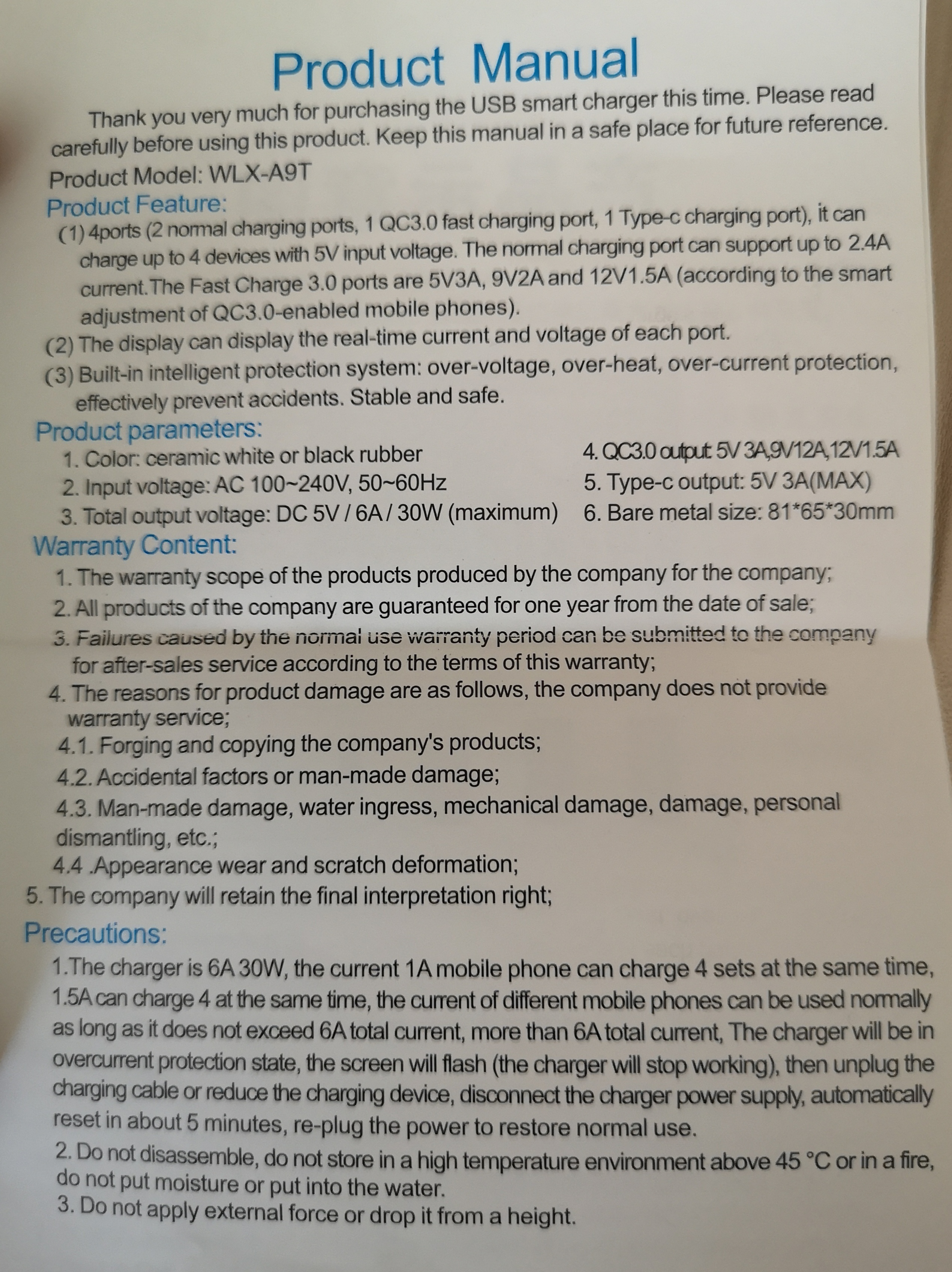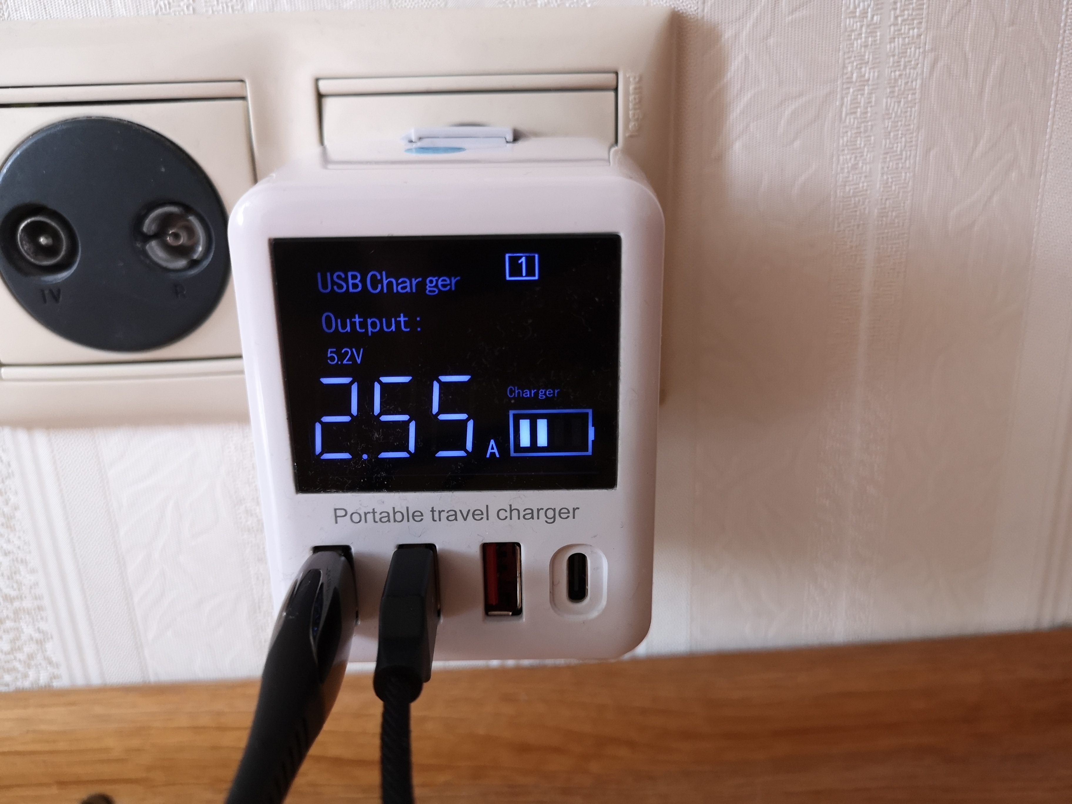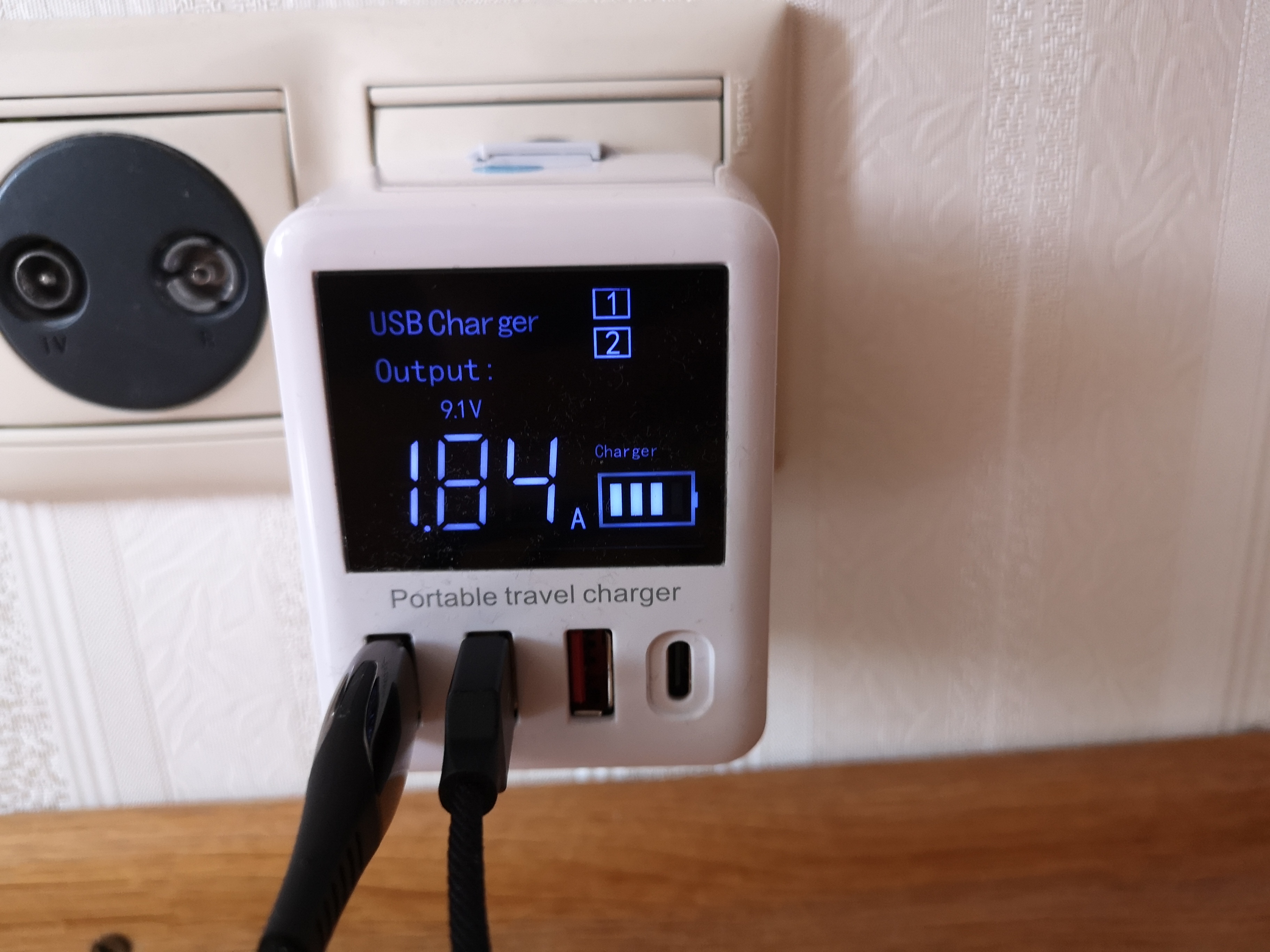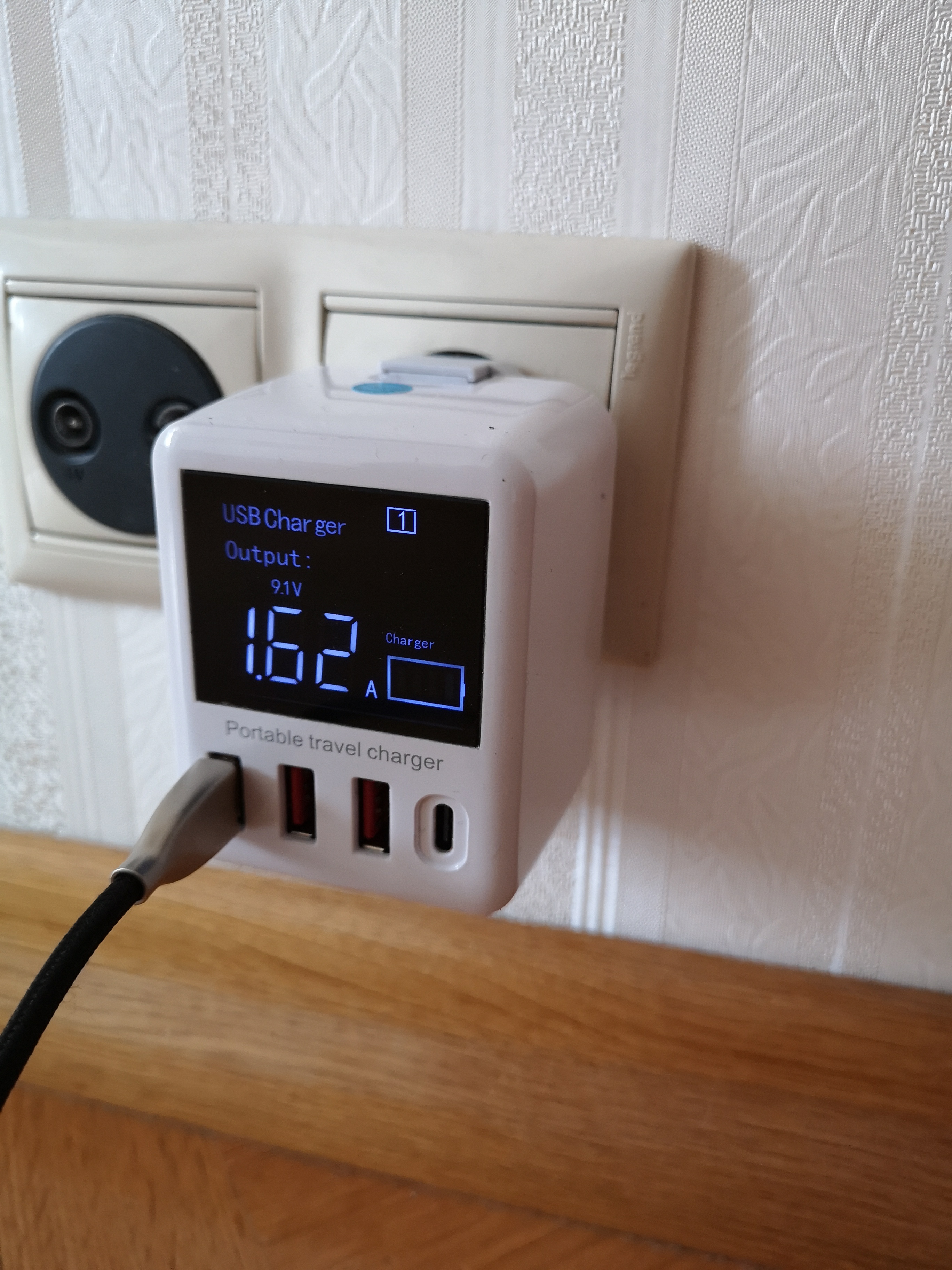 Huawei заряжает напряжением 9 V и током 1.5-2 A. Собственно, на фото как раз Huawei подключен.Забыл добавить: индикация портов попеременная.