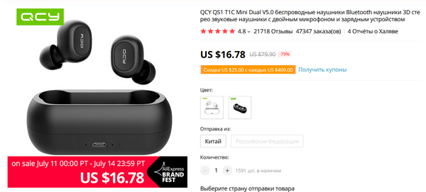 Ну и на true wireless QCY T1 тоже большая скидка.