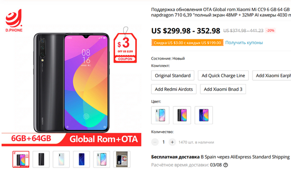 На Aliexpress уже появился Xiaomi Mi CC9. За свои деньги выглядит очень привлекательно, также у него добавился сверхширик (три камеры, как и у Xiaomi Mi 9), я обязательно буду покупать и изучать, но - внимание! - это пока чисто китайская версия, так что у него только китайский и английский. (Прошивки с русским, насколько я понимаю, пока нет.) Ну и, соответственно, я ее покупать не буду (для обзора не годится), дождусь, пока появится версия для европейского рынка (она, кстати, скорее всего, будет по-другому называться).