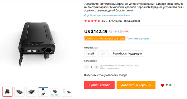 Для любителей походов, рыбалки и выездов подальше от цивилизации - внешний аккумулятор на 72000 мАч (!) с прикуривателем для автомобиля. Мне такой в Испании без надобности (пока, по крайней мере), но в России обязательно бы купил и кинул в машину. Удовольствие, конечно, недешевое, но при определенных обстоятельствах может очень того стоить.
