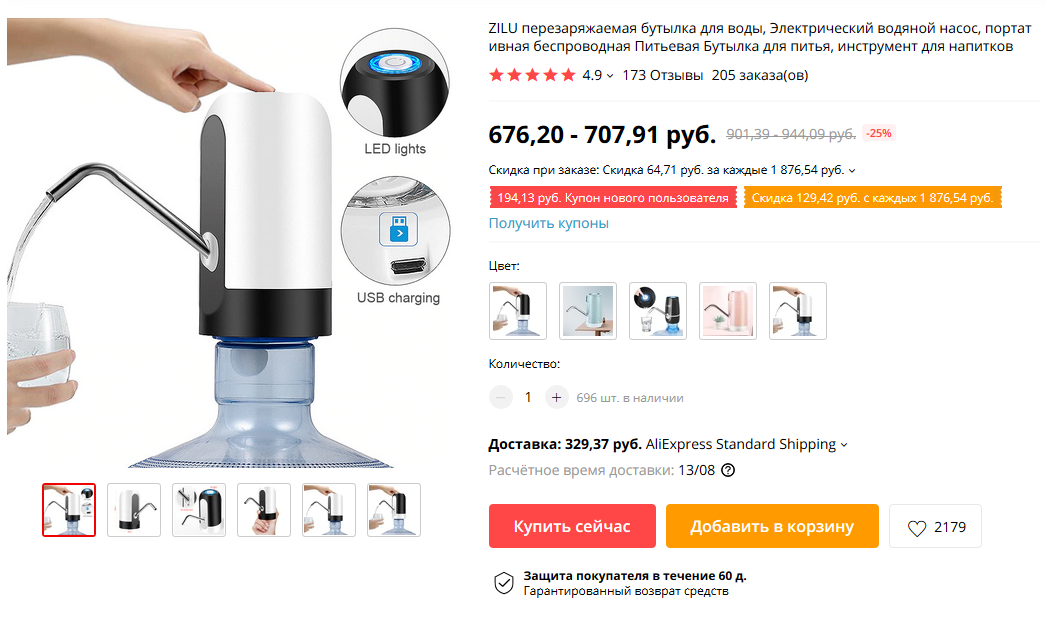 Помпа для бутилируемой воды с подзарядкой по USB и подсветкой.