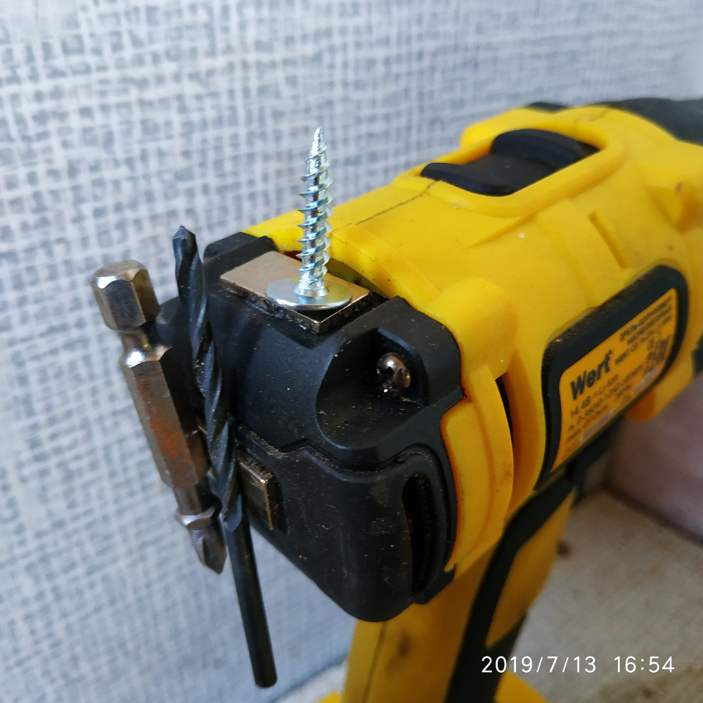 Долго (лет 10) у меня был шуруповёрт с магнитной площадкой для всякой мелочевки. Привык. Но ничто не вечно под луной, сломался. В магазине за адекватные деньги шурика с такой магниткой не нашлось. Пришлось колхозить. Купил на Али такие магнитики. Приклеил суперклеем на шурика, получилось вот так