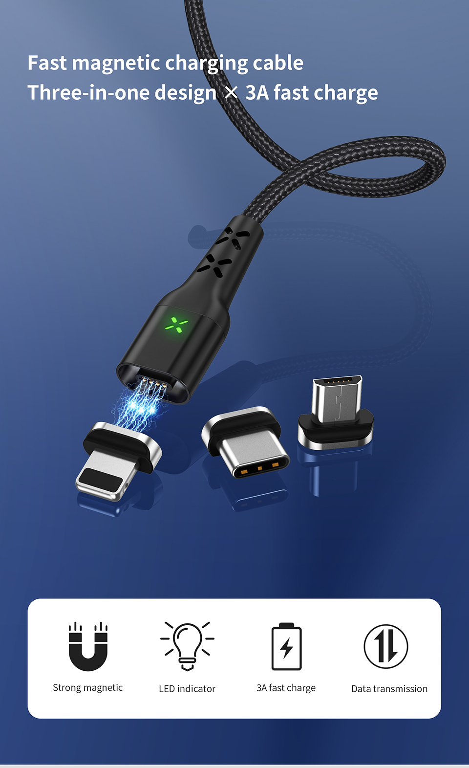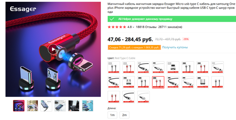 Многие пользователи любят кабели с магнитными головками, потому что они защищают порт смартфона от выламывания (как известно, детишки часто очень неаккуратно подключают/отключают кабели). Да и удобные они: поднес головку к смартфону - кабель сам присоединился. Так вот, очередные качественные кабели с удобной магнитной головкой - вот такой. Под разные порты, разных цветов, метровые и двухметровые.