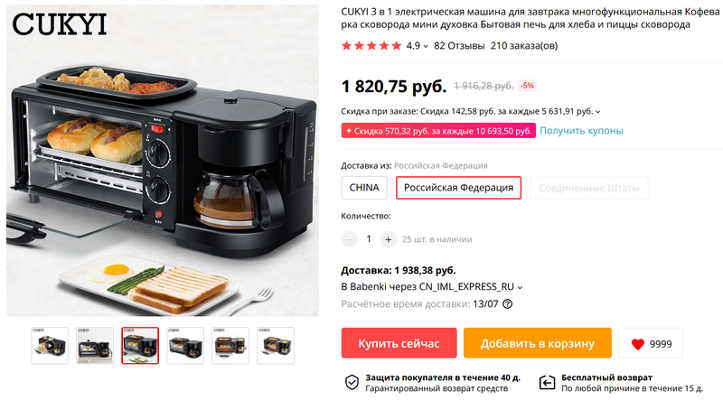 Интересный компактный агрегат "3 в 1" для кухни: мини-духовка, сковородка, кофеварка. Под четыре тысячи рублей (включая доставку). Искал с бесплатной доставкой, нашел, но он при этом стоит 5600, данный вариант дешевле. И доставка с российского склада есть. Для одиноких, для офисов, для дач-фазенд.
