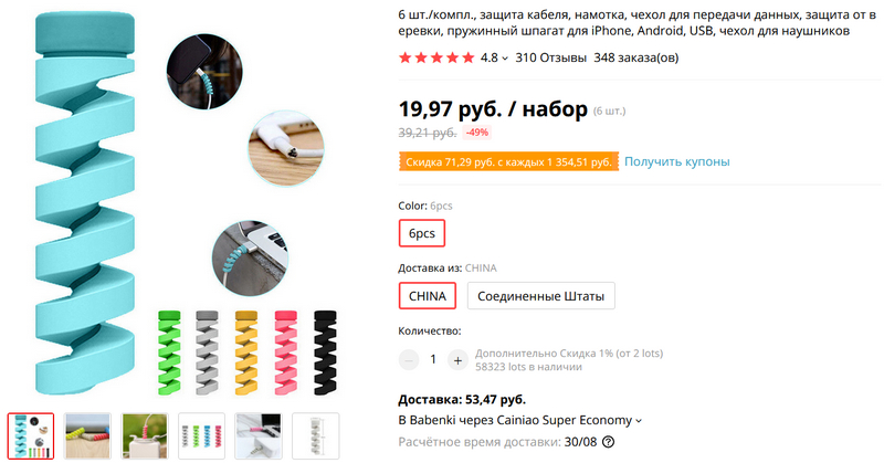 Как известно, кабели имеют обыкновение перетираться и ломаться в местах сгибов. Особенно обидно, когда это происходит с дорогущими кабелями от Apple. Но если место сгиба защитить вот такой завитушкой, то кабель прослужит намного дольше, особенно если это кабель от Apple. Комплект из 6 разноцветных завитушек стоит 20 рублей, но еще 54 рубля доставка - получается слегка безумная сумма в 74 рубля. Попробовал поискать, нет ли таких с бесплатной доставкой, оказалось, что без разницы. Если доставка бесплатная, то те же 74 рубля, если доставка 34 рубля, то набор стоит 40 рублей. Те же помидоры, короче говоря, только в профиль.