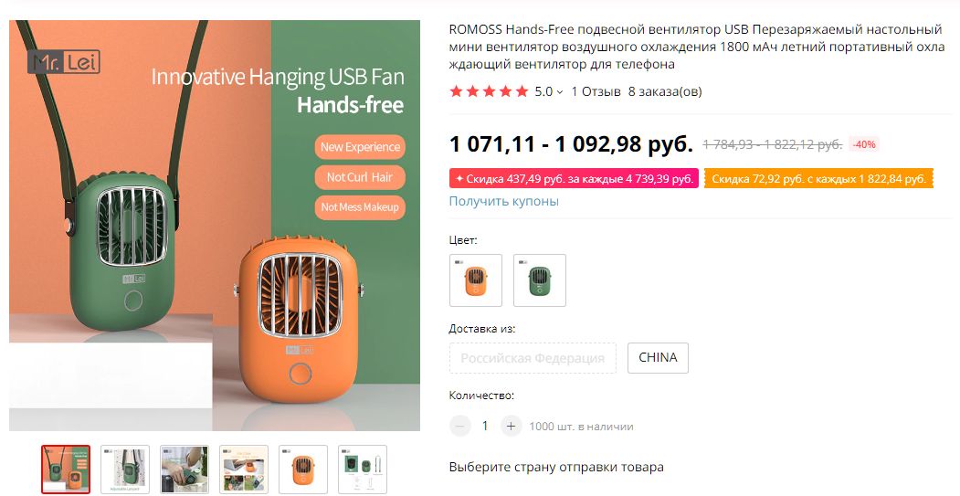 Жене, в силу состояния здоровья, постоянно жарко. В своё время были испробованы всевозможные веера, гибкие вентиляторы от MI с повер-банком. Недавно наткнулись на новую модель от Romoss и Mr.Lei. Второй день в постоянном использовании. В полном восторге. Качество исполнения на очень хорошем уровне, три скорости, можно повесить на шею или установить на стол. Достаточно продолжительное время работы. В Мск зашла из Китая менее чем за 14 дней.