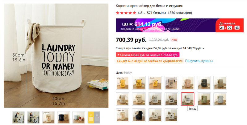 Большой выбор удобных бельевых корзин различных размеров и цветов. Плотный материал, внутри водонепроницаемая пропитка. Отзывы очень хорошие. Также есть несколько веселеньких корзин для игрушек такого же типа.
