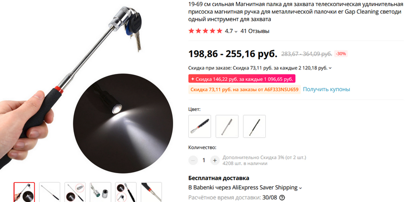 Полезная в хозяйстве вещь - телескопическая палка (19-65 см) с сильным магнитом на конце и фонариком: доставать всякие закатившиеся металлические предметы. Я ее как увидел - сразу же заказал: несколько раз очень жалел, что у меня нет такой штуки.