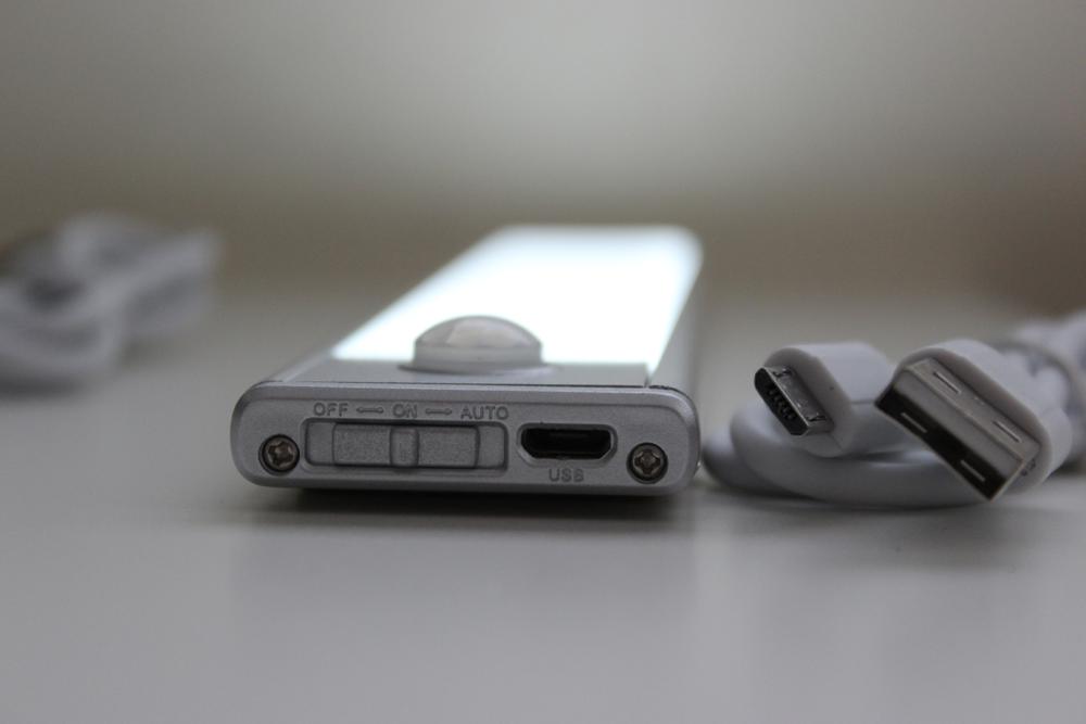 Светильник на аккумуляторе. Очень тонкий в отличие от подобных на батарейках. К тому же на батарейки тратиться не надо. Держится на магнитах, то есть легко снимается, например на подзарядку. Металлические планки и двусторонний скотч прилагаются. Включается от датчика движения и в зависимости от степени освещенности. Есть варианты с разной длиной 23/40/60 см., а также с теплым или холодным светом. Идеально для установки в шкафах, выдвижных ящиках и багажнике автомобиля.