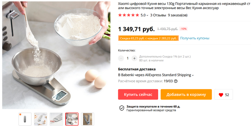 Заказал себе очень компактные цифровые кухонные весы от Xiaomi. Мне главное - компактные. А то нынешние - и мешаются, и на дисплее правый вертикальный символ в последней цифре быстро сдох, так что весы меня теперь приветствуют бодрым словом HELL, да и легкие продукты нормально не взвесить. У этих, разумеется, есть режим сброса веса тары и они могут подстраиваться под размер емкостей.
