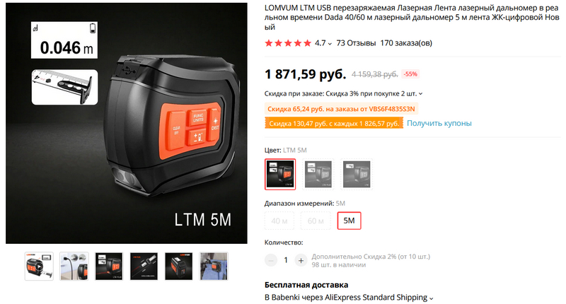 Поизучал несколько вариантов очень похожей стоимости, остановился на рулетке Lomvum - вроде бы это довольно известный бренд, который производит всевозможный инструментарий. За 1870 - просто 5-метровая рулетка с дисплеем. За 3 тысячи - она будет еще и с лазерным дальномером на 40 метров, еще дороже - с дальномером на 60 метров. Мне дальномер, в общем-то, не нужен (давно все задальномерил), поэтому заказал просто рулетку - вот она нужна довольно часто.