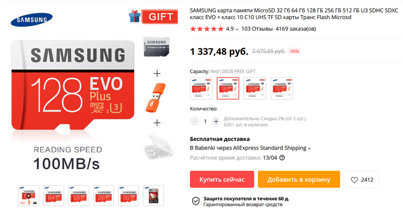 Быстрые карты памяти microSD Samsung EVO Plus разных размеров. С переходником под SD и с кардридером под USB. Сравнил с предложениями на Яндекс.Маркете - выигрыш в зависимости от размера получается где-то от 200 до 800 рублей. Немного, но тем не менее. С Испанией разница получается заметно больше, также у нас 512 ГБ я и вовсе не нашел, а тут есть.
