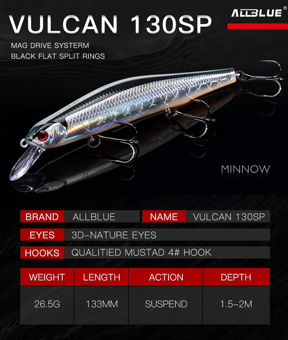 Для рыбаков: шикарный воблер ALLBLUE VULCAN 130SP это копия на известный Орбит 130 от китайского бренда ALLBLUE. Качество на высоком уровне, фурнитура надежная, есть система дальнего заброса, покраска крепкая, 12 вариантов расцветок. Продуманы даже такие мелочи как маркировка веса, размера и заглубления на самой болванке (теперь не надо вспоминать эту информацию на рыбалке). "Играет" привлекательно, практически идеальный суспендер. Думаю в этом сезоне будет у меня в ТОПе по крупной щуке.