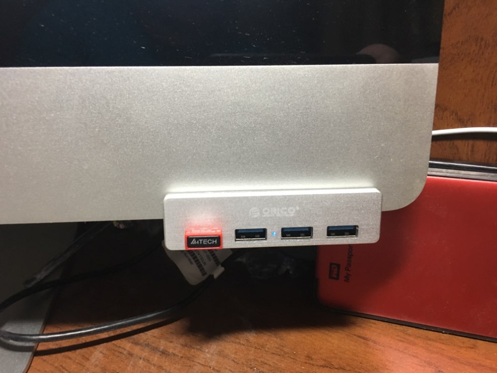 Классный USB-хаб от ORICO. Можно крепить либо к монитору, либо на краю стола.