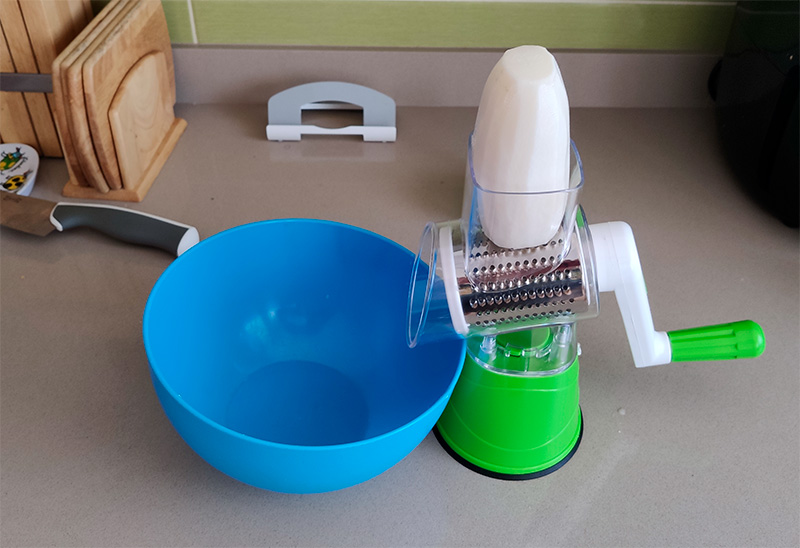 А я помню, что у меня когда-то в Москве была удобная механическая терка с ручкой. С ней была только одна проблема - уж больно она елозила по столу, когда приходилось тереть что-то твердое, вроде редьки или морковки.