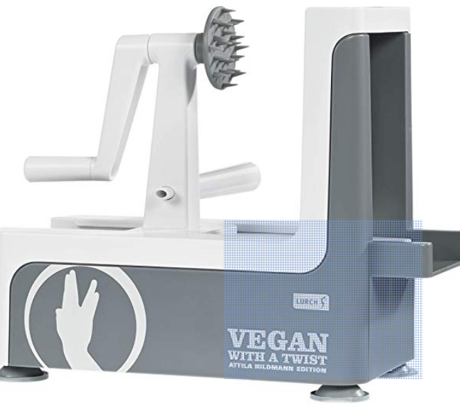 Порылся у китайцев. Нашел именно то, что искал - механическая терка с ручкой и сменными насадками. Только у этой, в отличие от моей, на подставке еще и мощная присоска, так что эта терка по столу не елозит - хоть гвозди на ней натирай.