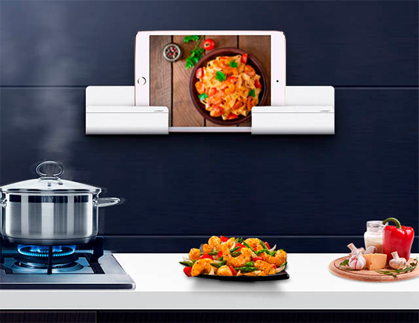 Upd: Разумеется, вешать планшет не рядом с плитой (не как на картинке) и развести держатели пошире под конкретный планшет, чтобы они не загораживали экран.