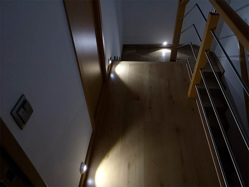 Действительно яркие, действительно срабатывают совершенно четко. Вот они у меня на третьем этаже. Если я выхожу из комнаты, где горит свет (сзади на фото), то первый светильник не срабатывает - света и так достаточно. Второй и третий срабатывают железно - там уже света мало. Горят по 20 секунд - этого вполне достаточно, чтобы спуститься по лестнице при освещении.