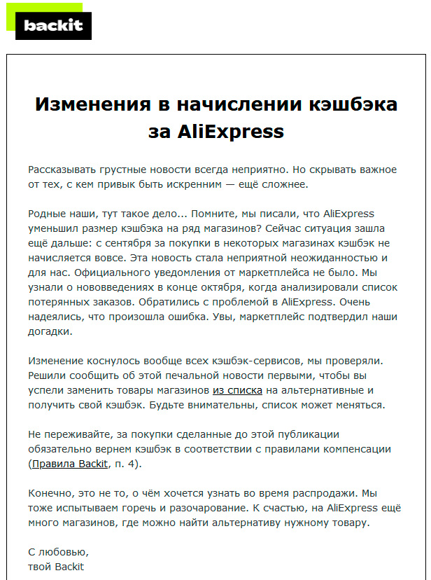 С 6 ноября кэшбэк не начисляется за некоторые товары из магазинов этого списка (ранее ставка составляла 0,5%). Точного списка товаров AliExpress не предоставляет. Список может обновляться, поэтому будьте внимательны перед покупкой.