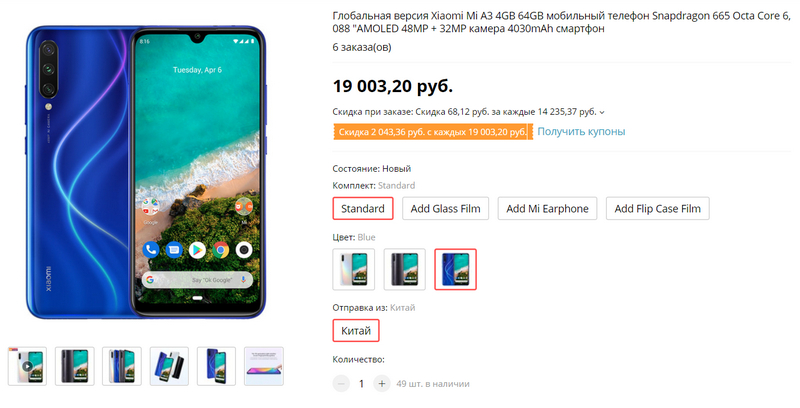 Совсем недавно появился в продаже Xiaomi Mi A3 (это европейская версия Xiaomi CC9e) - расхватывают, как горячие пирожки. Я успел ухватить за 16 тысяч в фирменном магазине Xiaomi, но взял буквально последний. У них есть чуть дороже, но там тоже всего 4-5 экземпляров, сейчас закончатся. Единственный магазин, где пока есть какой-то запас - это Mi France Store, но он там за 19 тысяч.