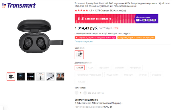 TWS-наушники Ugreen - 1308 рублей. Только SBC, но производитель хороший, так что должен быть вариант неплохой. Тоже, наверное, закажу попробовать.