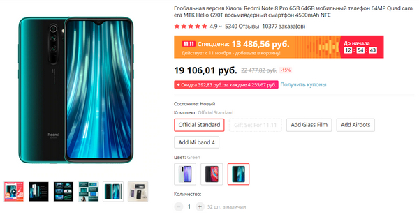 Заказал родственнику Xiaomi note 8 pro зеленый 6/128 за 12800р (14400р без купонов) и чехол за 40 рублей (360р без купонов). У Алекса ссылка на 6/64 и дешевле на 1к руб., тут, думаю, смысла нет экономить на памяти.